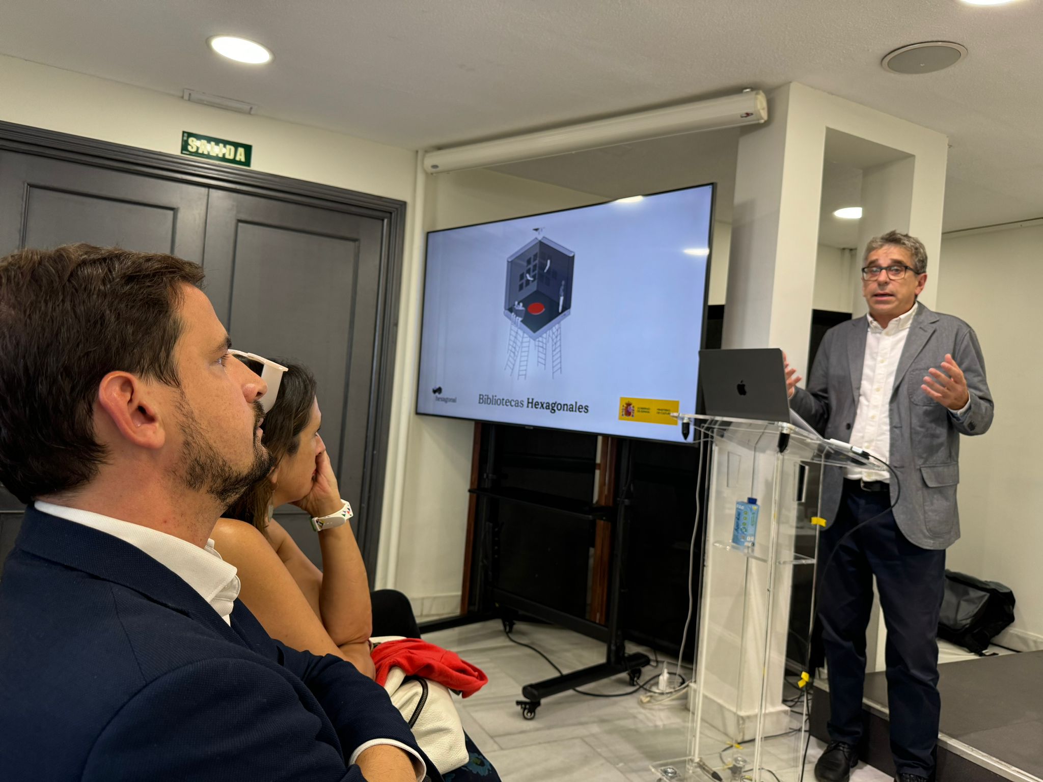 El pasado 30 de septiembre en el Círculo de Bellas de Madrid se presentó el proyecto y la monografía Bibliotecas Hexagonales. En el acto se hizo entrega de la edición en papel a las personas asistentes. La presentación contó con la participación del Secretario de Estado de Cultura, Jordi Martí Grau, la Subdirectora General de Coordinación Bibliotecaria, Laura Guindal Martínez, y el director de Hexagonal, Raúl Oliván Cortés.