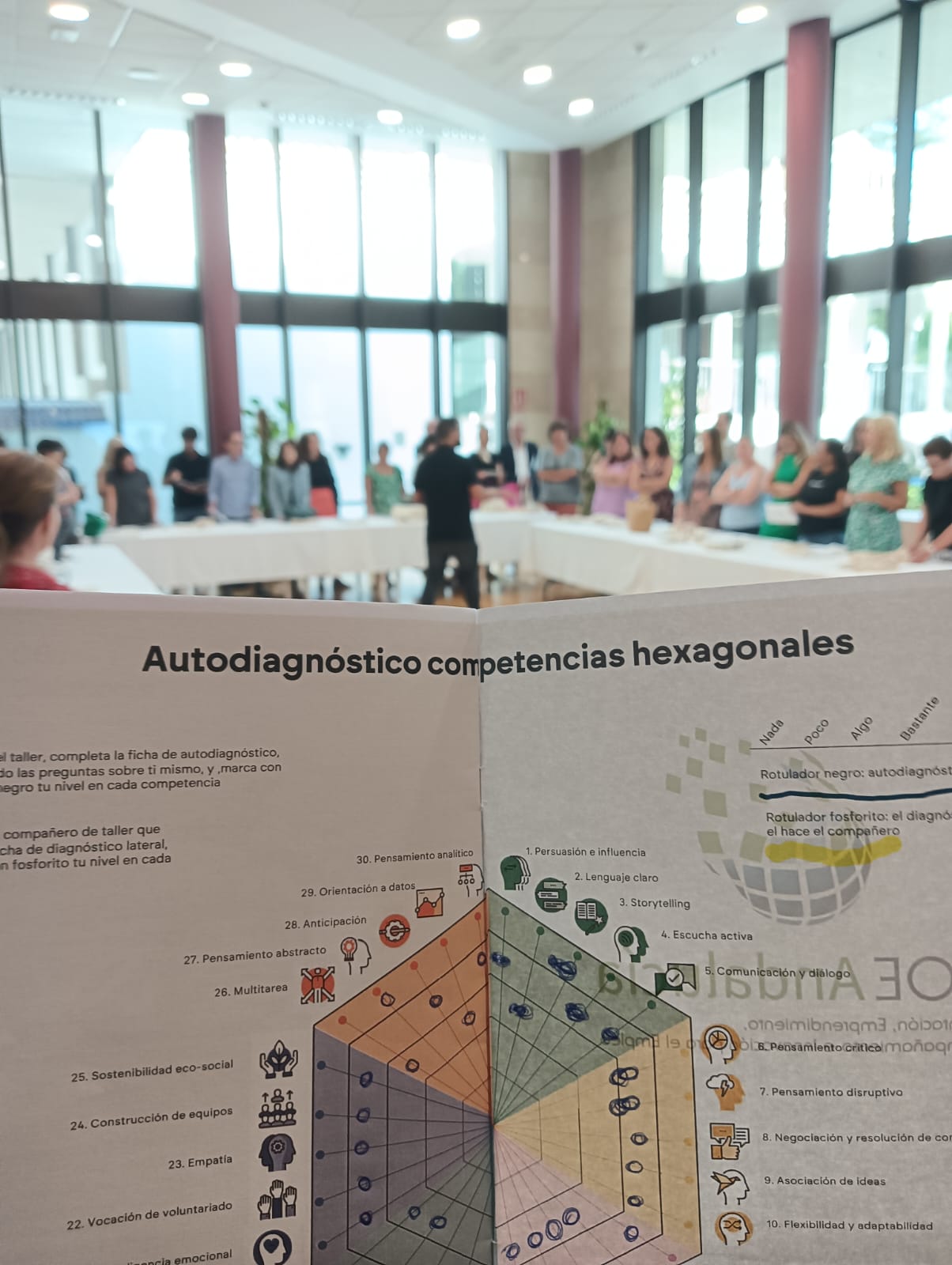 En esta ocasión, CocinaLAB puso el foco en personas desempleadas de más de 52 años y trabajó tanto con profesionales de la orientación y la inserción, como personas en desempleo. Las competencias adquiridas, como la creatividad, la planificación, el trabajo en equipo y la experimentación, son esenciales tanto en la cocina como en el ámbito laboral. A través de esta metodología experiencial, los participantes no solo identifican estas habilidades, sino que las ponen en práctica mientras desarrollan prototipos de proyectos en una segunda parte del taller, en el que se usan diversas metodologías de diseño social y colaborativo, dando sentido a todo el enfoque sistémico del hexágono.