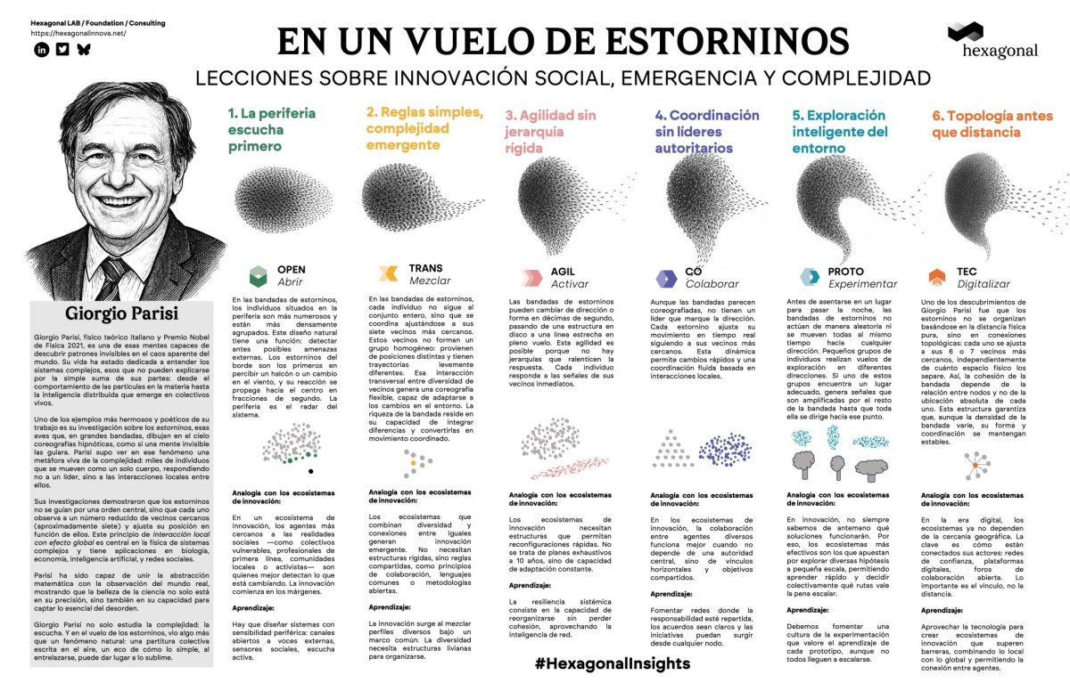 Aunque llevamos años usando imágenes de los estorninos para explicar el concepto filosófico de emergencia (propiedades, patrones o comportamientos complejos que surgen de la interacción entre elementos más simples, de manera que el todo posee características que no pueden ser explicadas únicamente por las partes individuales), leyendo a Parisi pudimos ir todavía más lejos. De pronto, la bandada de estorninos se nos antojó una bella metáfora de los ecosistemas de innovación, y en su comportamiento emergente quisimos ver trazas de los seis vectores (abrir, mezclar, agilizar, experimentar, colaborar y digitalizar).