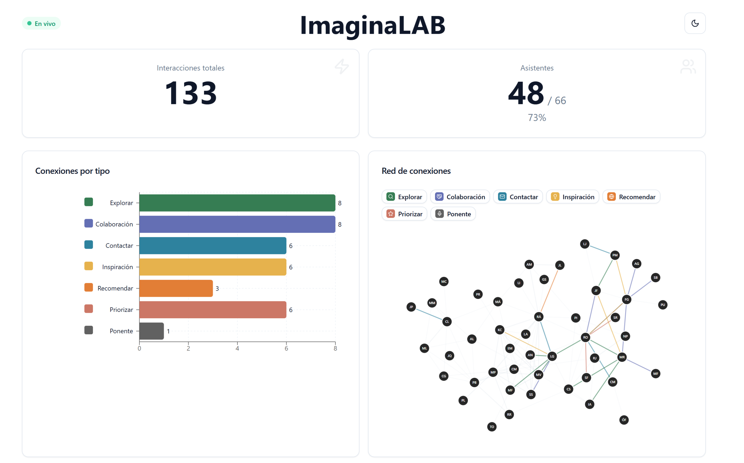Los datos del estreno: 133 interacciones registradas entre los 48 asistentes. Un 45% de participación activa en la plataforma. Las conexiones más frecuentes fueron de dos tipos: inspiración y colaboración, lo que nos confirmó que los principales objetivos del ImaginaLAB se cumplieron.