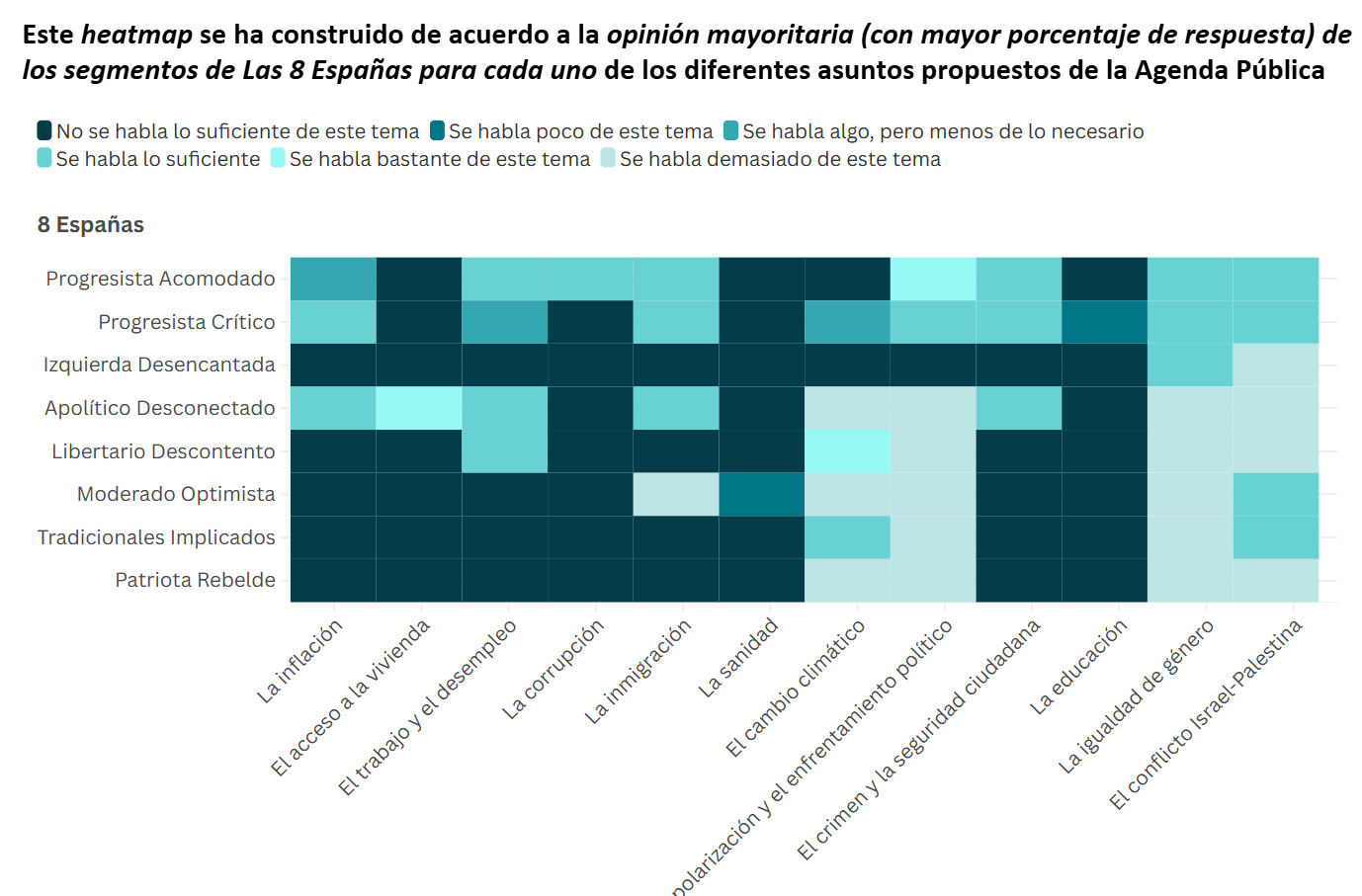 • Activar desde la fatiga, no desde la confrontación. Predominan el hartazgo y la frustración, no la ira. Las estrategias deben reducir saturación, simplificar mensajes y ofrecer soluciones tangibles.