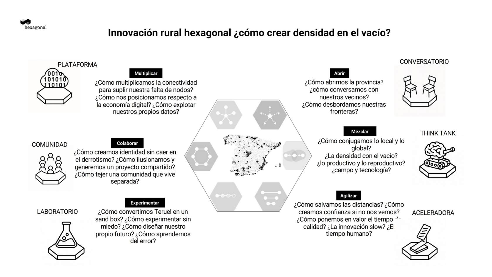 En el núcleo de su intervención, Oliván condensó 25 años de experiencia de trabajo en una idea operativa: la densidad relacional se construye mediante los seis vectores del Modelo de Innovación Hexagonal: abrir, mezclar, agilizar, experimentar, colaborar y multiplicar. Esos vectores funcionan para unir personas, ideas, territorios, recursos y organizaciones. Al aplicarlos a través de un conjunto de mecanismos y metodologías podemos “crear densidad donde parece predominar el vacío”.