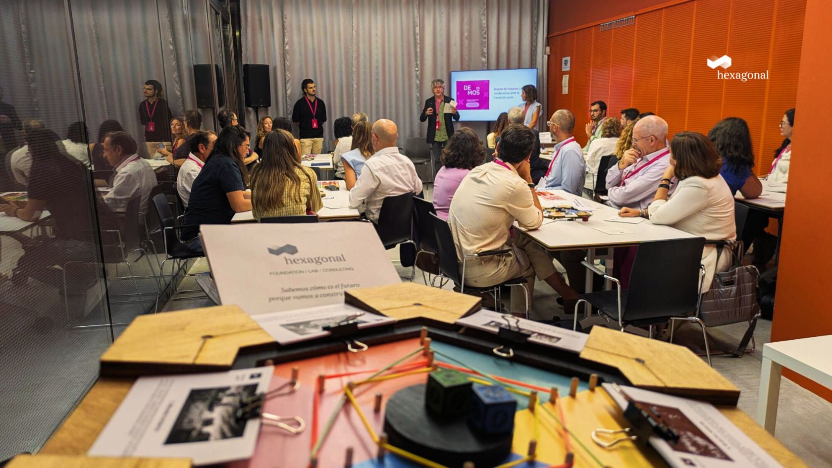 Cada equipo construyó una sociedad ficticia. Utilizó dimensiones como clima, digitalización, polarización, desigualdad... Fue inspirador ver cómo surgieron ideas que divergían y convergían hasta llevarnos al portfolio de proyectos. El objetivo era diseñar respuestas estratégicas a retos reales que enfrentan hoy las fundaciones. Articulamos cambio sistémico, al ritmo de uno de nuestros juegos hexagonales.
